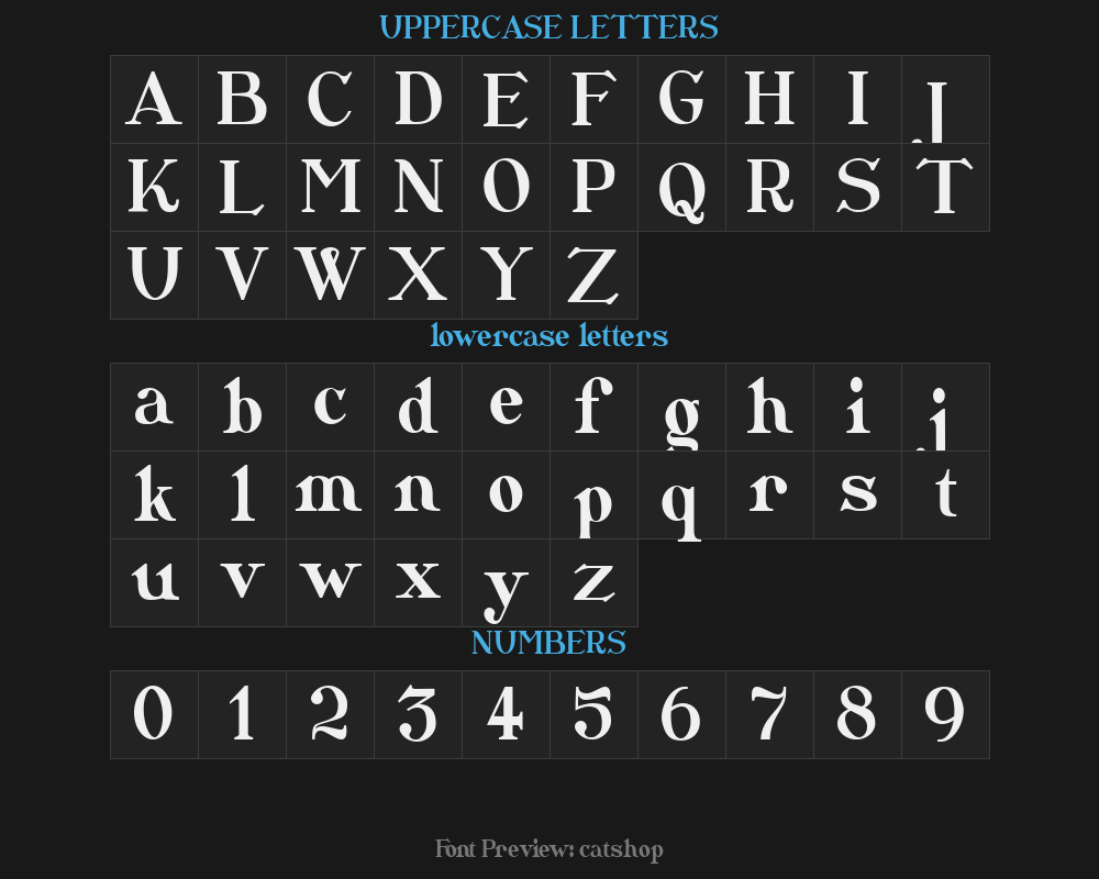catshop is a font file with a size of 0.08 MB. The full font name is CatShop, Version 1.000 2009 initial release version. It contains 216 characters, supports 8 Chinese characters. The copyright belongs to CatShop. catshop font is available for free download, but commercial use requires confirmation on the CatShop official website whether it's free for commercial use.
