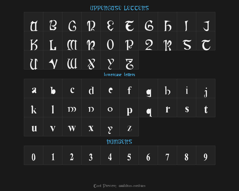 cauldron-medium is a font file with a size of 0.03 MB. The full font name is Cauldron Medium, 1.0 Tue Dec 06 05 21 01 1994 version. It contains 96 characters, supports 8 Chinese characters. The copyright belongs to Cauldron. cauldron-medium font is available for free download, but commercial use requires confirmation on the Cauldron official website whether it's free for commercial use.