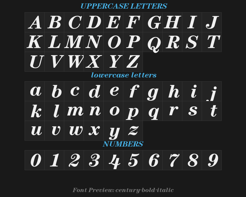 century-bold-italic is a font file with a size of 0.05 MB. The full font name is Century Bold Italic, Altsys Fontographer 3.5 11 6 92 version. It contains 207 characters, supports 8 Chinese characters. The copyright belongs to Century. century-bold-italic font is available for free download, but commercial use requires confirmation on the Century official website whether it's free for commercial use.