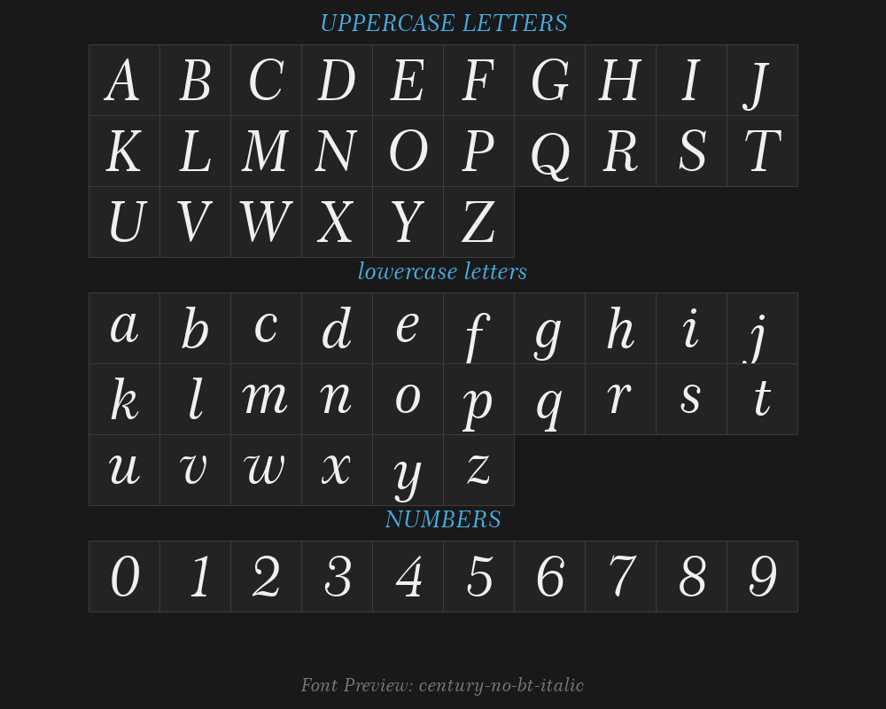 century751-no2-bt-italic is a font file with a size of 0.05 MB. The full font name is Century751 No2 BT Italic, mfgpctt-v4.4 Mon Jun 28 18 11 49 EDT 1999 version. It contains 259 characters, supports 8 Chinese characters. The copyright belongs to Century751 No2 BT. century751-no2-bt-italic font is available for free download, but commercial use requires confirmation on the Century751 No2 BT official website whether it's free for commercial use.