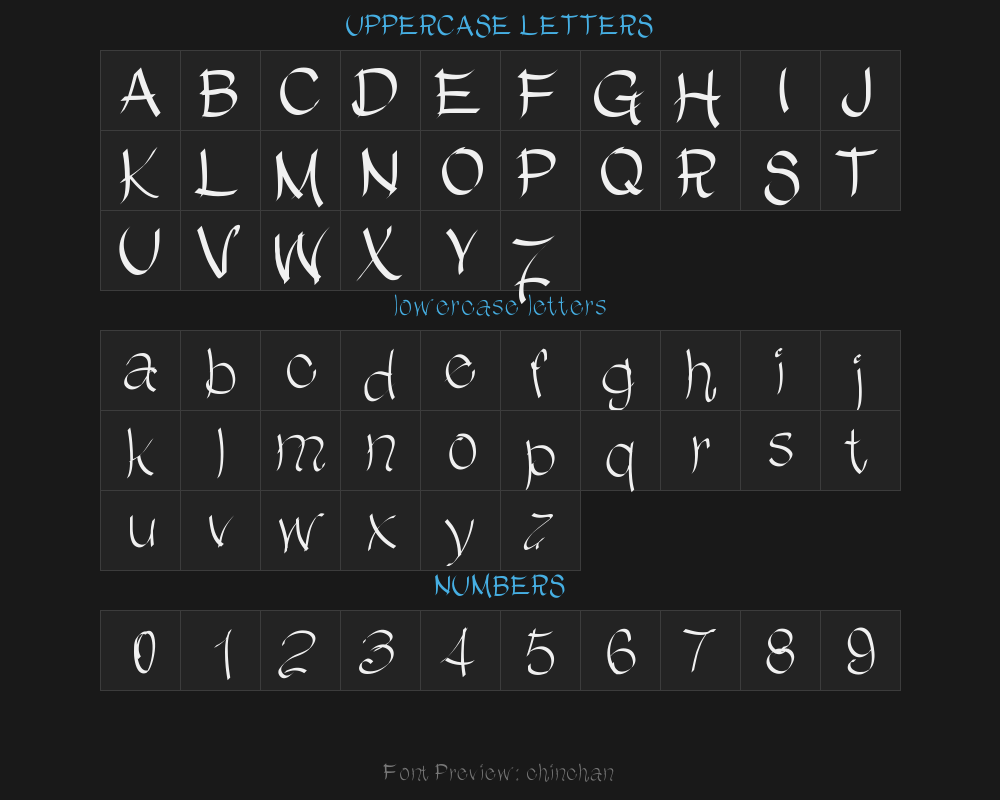 chinchan is a font file with a size of 0.05 MB. The full font name is ChinChan, Version 001.000 version. It contains 252 characters, supports 8 Chinese characters. The copyright belongs to ChinChan. chinchan font is available for free download, but commercial use requires confirmation on the ChinChan official website whether it's free for commercial use.