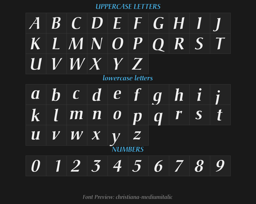 christiana-mediumitalic is a font file with a size of 0.04 MB. The full font name is Christiana-MediumItalic, 001.000 version. It contains 228 characters, supports 8 Chinese characters. The copyright belongs to Christiana. christiana-mediumitalic font is available for free download, but commercial use requires confirmation on the Christiana official website whether it's free for commercial use.
