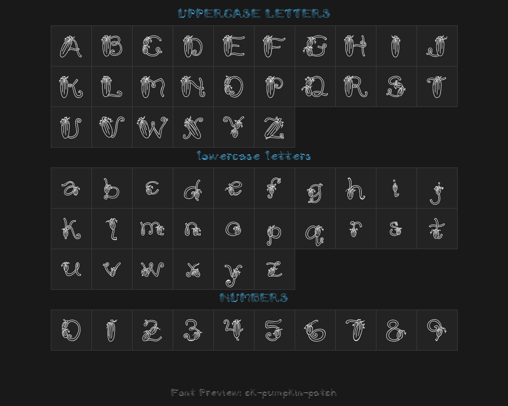 ck-pumpkin-patch is a font file with a size of 0.09 MB. The full font name is CK Pumpkin Patch, 4 20 2000 version. It contains 203 characters, supports 8 Chinese characters. The copyright belongs to CK Pumpkin Patch. ck-pumpkin-patch font is available for free download, but commercial use requires confirmation on the CK Pumpkin Patch official website whether it's free for commercial use.