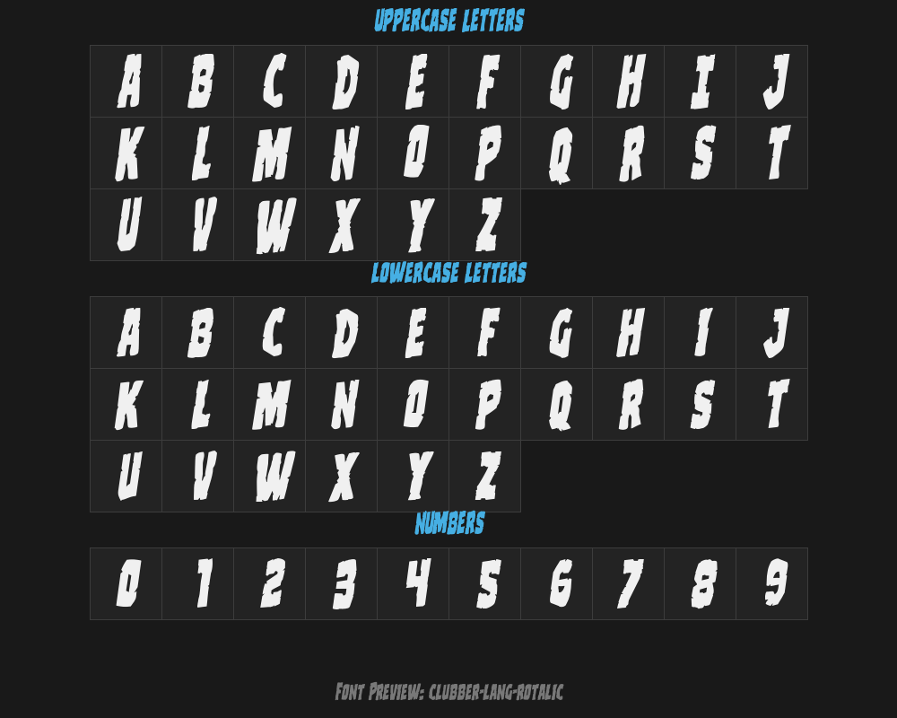 clubber-lang-rotalic is a font file with a size of 0.09 MB. The full font name is Clubber Lang Rotalic, Version 1.0; 2013 version. It contains 219 characters, supports 8 Chinese characters. The copyright belongs to Clubber Lang Rotalic. clubber-lang-rotalic font is available for free download, but commercial use requires confirmation on the Clubber Lang Rotalic official website whether it's free for commercial use.