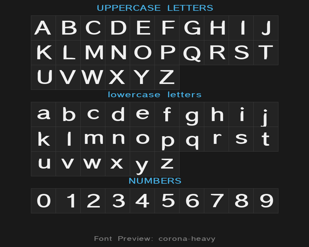 corona-heavy is a font file with a size of 0.05 MB. The full font name is Corona Heavy, Version 2.0 - 18 Nov 98 version. It contains 242 characters, supports 8 Chinese characters. The copyright belongs to Corona Heavy. corona-heavy font is available for free download, but commercial use requires confirmation on the Corona Heavy official website whether it's free for commercial use.