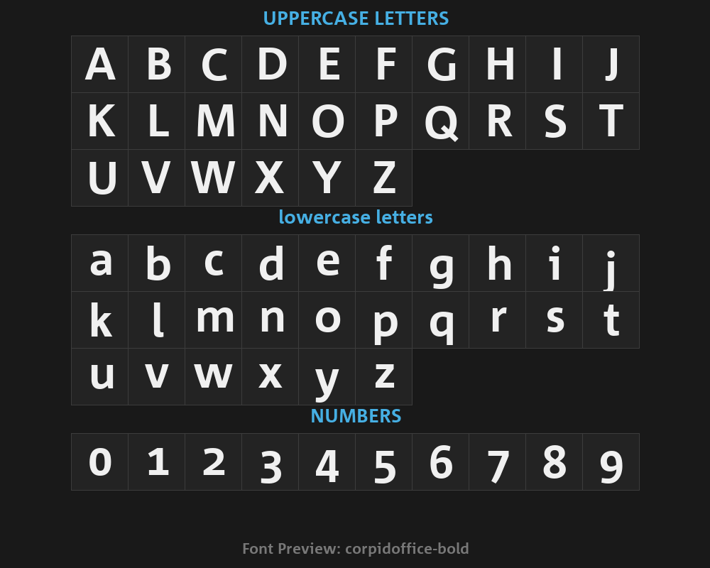 corpidoffice-bold is a font file with a size of 0.08 MB. The full font name is CorpidOffice Bold, Version 2.2; 2000 version. It contains 276 characters, supports 8 Chinese characters. The copyright belongs to CorpidOffice. corpidoffice-bold font is available for free download, but commercial use requires confirmation on the CorpidOffice official website whether it's free for commercial use.