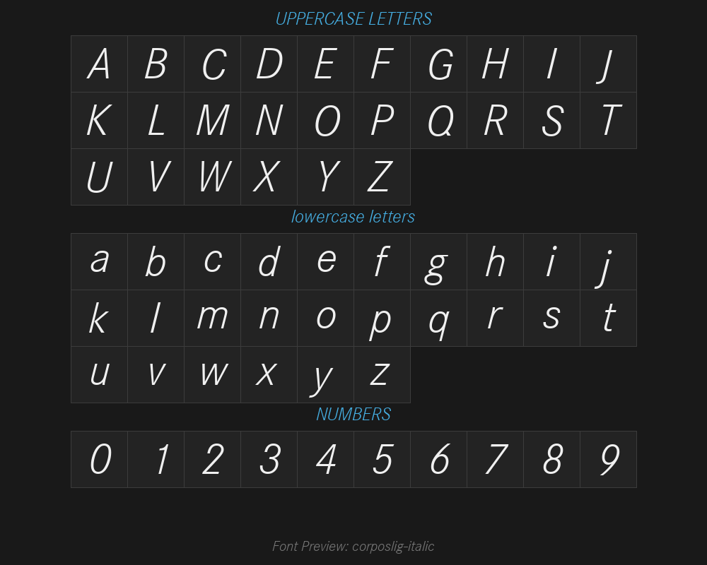 corposlig-italic is a font file with a size of 0.05 MB. The full font name is CorpoSLig Italic, Version 001.004 version. It contains 244 characters, supports 8 Chinese characters. The copyright belongs to CorpoSLig. corposlig-italic font is available for free download, but commercial use requires confirmation on the CorpoSLig official website whether it's free for commercial use.