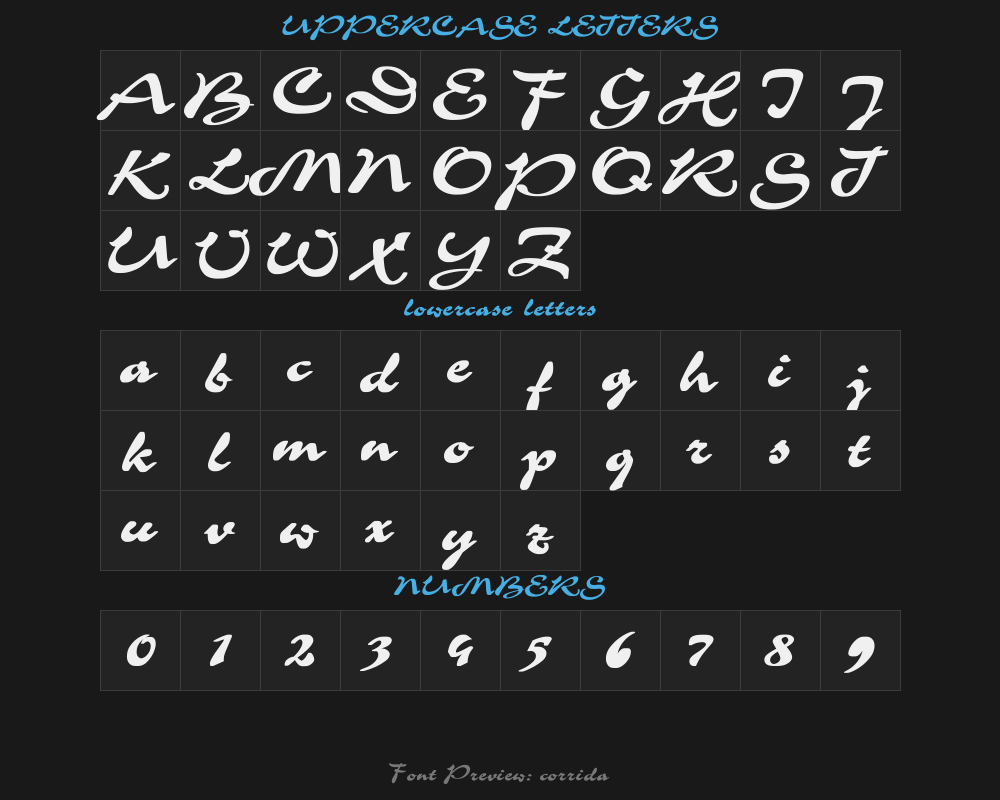 corrida1 is a font file with a size of 0.08 MB. The full font name is Corrida Bold, Converted from c windows system CRR_____.BF1 by ALLTYPE version. It contains 313 characters, supports 8 Chinese characters. The copyright belongs to Corrida. corrida1 font is available for free download, but commercial use requires confirmation on the Corrida official website whether it's free for commercial use.