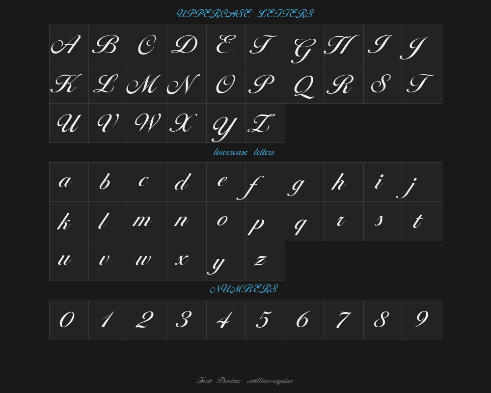 cotillion-regular is a font file with a size of 0.05 MB. The full font name is Cotillion Regular, Altsys Fontographer 3.5 7 15 93 version. It contains 216 characters, supports 8 Chinese characters. The copyright belongs to Cotillion. cotillion-regular font is available for free download, but commercial use requires confirmation on the Cotillion official website whether it's free for commercial use.