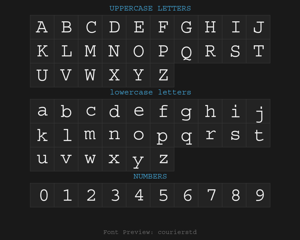 courierstd is a font file with a size of 0.04 MB. The full font name is CourierStd, Version 2.015;PS 2.000;hotconv 1.0.51;makeotf.lib2.0.18671 version. It contains 373 characters, supports 8 Chinese characters. The copyright belongs to Courier Std. courierstd font is available for free download, but commercial use requires confirmation on the Courier Std official website whether it's free for commercial use.