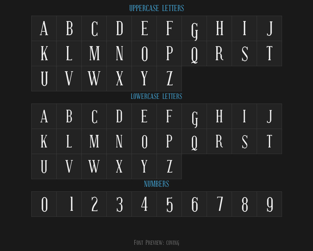coving21 is a font file with a size of 0.05 MB. The full font name is Covington SC Cond, Version 1.0; 2001; initial release version. It contains 225 characters, supports 8 Chinese characters. The copyright belongs to Covington SC Cond. coving21 font is available for free download, but commercial use requires confirmation on the Covington SC Cond official website whether it's free for commercial use.