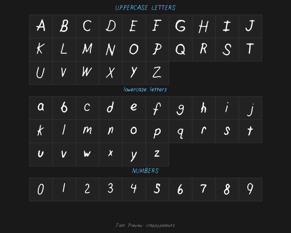 crappypeanuts is a font file with a size of 0.03 MB. The full font name is CrappyPeanuts, Version 001.000 version. It contains 140 characters, supports 8 Chinese characters. The copyright belongs to CrappyPeanuts. crappypeanuts font is available for free download, but commercial use requires confirmation on the CrappyPeanuts official website whether it's free for commercial use.