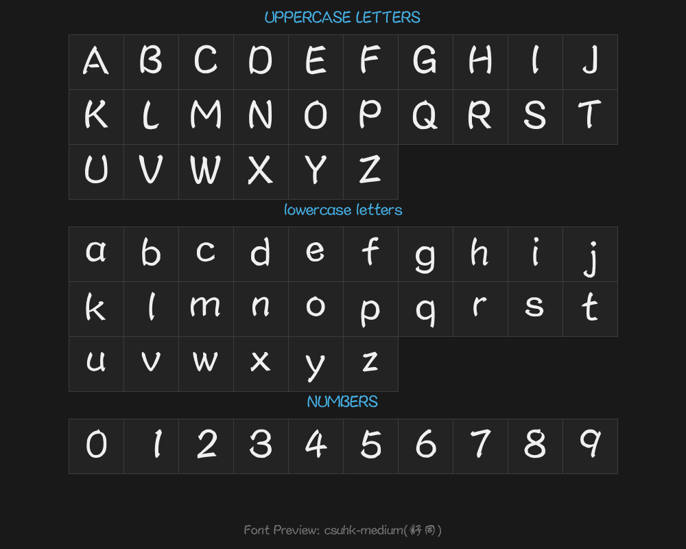 csuhk-medium(Shu Tong) is a font file with a size of 7.23 MB. The full font name is CSuHK-Medium, Version 1.00 version. It contains 23436 characters, supports 15280 Chinese characters. The copyright belongs to CSuHK-Medium. csuhk-medium(Shu Tong) font is available for free download, but commercial use requires confirmation on the CSuHK-Medium official website whether it's free for commercial use.