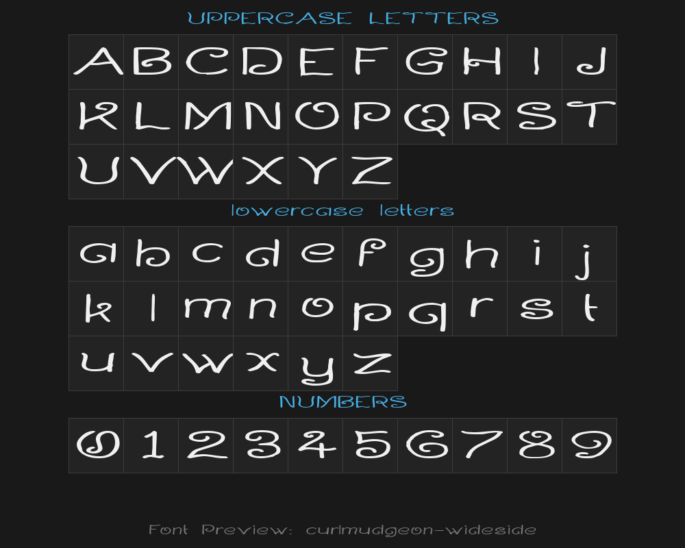 curlmudgeon-wideside is a font file with a size of 0.04 MB. The full font name is Curlmudgeon Wideside, 1.00 version. It contains 111 characters, supports 8 Chinese characters. The copyright belongs to Curlmudgeon Wideside. curlmudgeon-wideside font is available for free download, but commercial use requires confirmation on the Curlmudgeon Wideside official website whether it's free for commercial use.