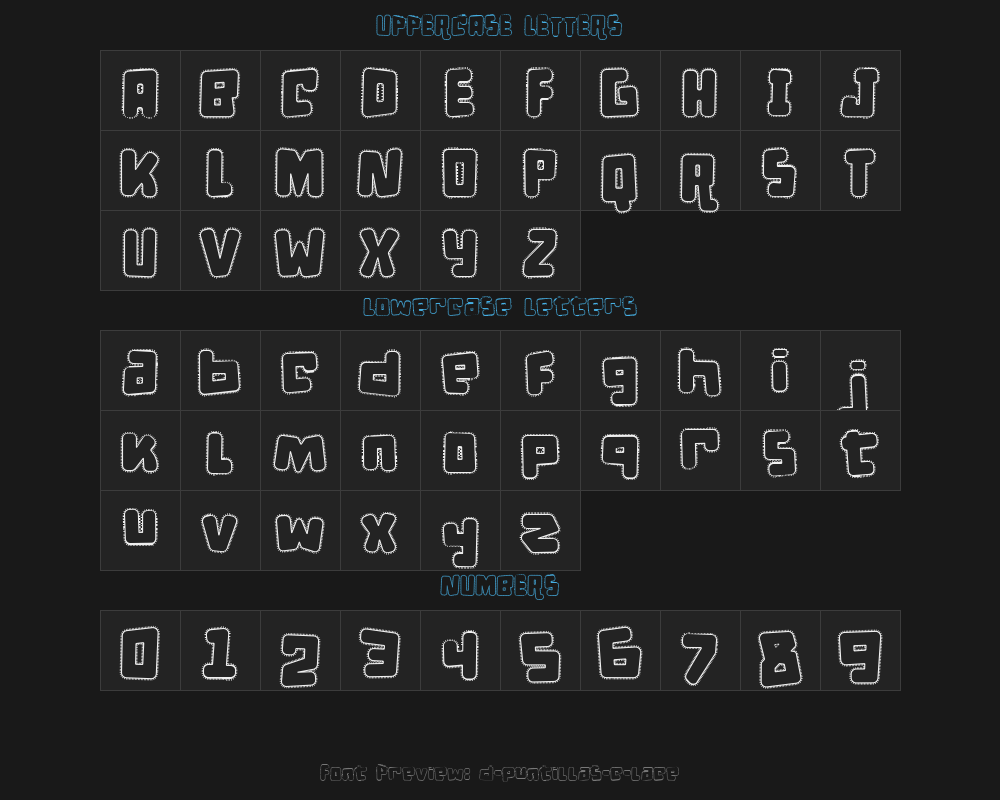 | Font description | D PUNTILLAS C LACE La familia tipográfica "d puntillas" es un conjunto de 6 fuentes display combinables para la creación de títulos, púramente tipográficos, a dos o tres colores. El desarrollo de esta tipografía surge de una propuesta, no aceptada, de un logotipo de 6 letras para un negocio llamado cactus. A partir del diseño original he creado el resto del alfabeto. Y combinables también han sido los siguientes 3 conceptos por los cuales he nominado a este conjunto de fuentes Pasar d puntillas (to tiptoe) Tratar algo de pasada, sin profundizar ni insistir en ello.(DUE)... porque es un diseño tipográfico experimental. Puntillas a (Lace) Encaje generalmente estrecho que forma ondas o picos en una de sus orillas y que se pone como adorno en el borde de pañuelos, toallas, vestidos, etc.(RAE)... por el aspecto de las letras con puntillas. Puntillas de calamar (Tiptoes squid) Caprichosos calamares de tamaño diminuto, lo ideal es tomarlos fritos con una cervecita, echando humo a la orilla del mar de un verano cualquiera...y en honor a Joao Augusto meu sobrinho brasileriro al que le gustan mucho las puntillas de calamar. |