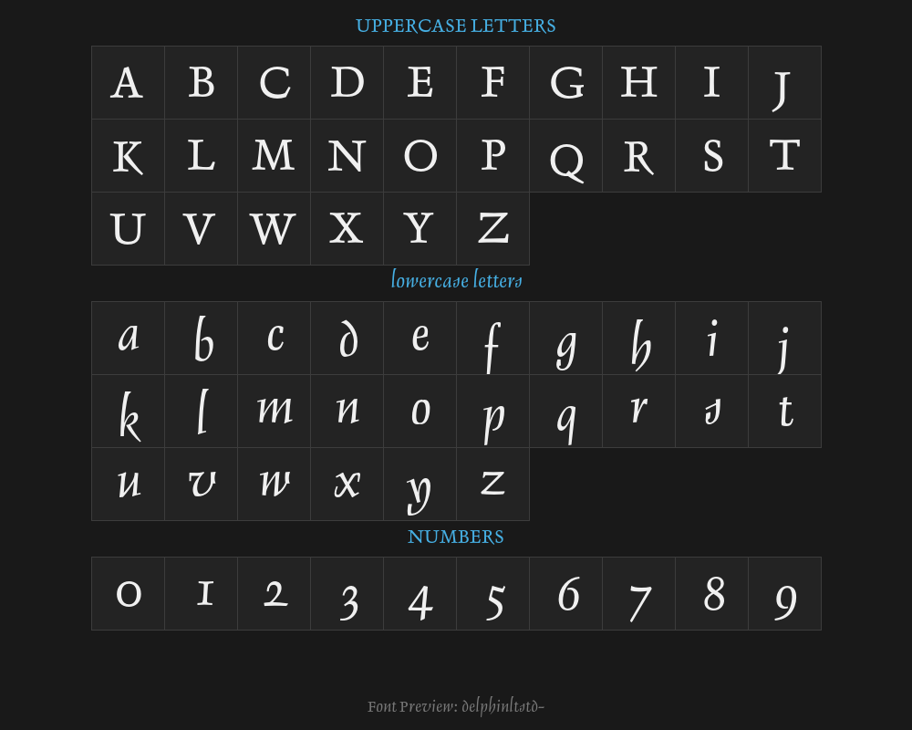 delphinltstd-1 is a font file with a size of 0.04 MB. The full font name is DelphinLTStd-1, Version 1.040;PS 001.000;Core 1.0.35;makeotf.lib1.5.4492 version. It contains 255 characters, supports 8 Chinese characters. The copyright belongs to Delphin LT Std 1. delphinltstd-1 font is available for free download, but commercial use requires confirmation on the Delphin LT Std 1 official website whether it's free for commercial use.