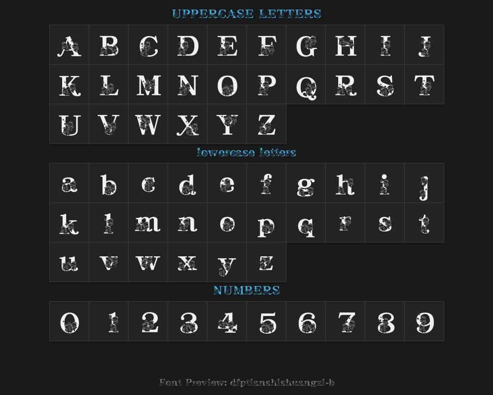 dfptianshishuangzi-b5 is a font file with a size of 30.60 MB. The full font name is DFPTianShiShuangZi-B5, Version 3.00 version. It contains 8 characters, supports 8 Chinese characters. The copyright belongs to DFPTianShiShuangZi-B5. dfptianshishuangzi-b5 font is available for free download, but commercial use requires confirmation on the DFPTianShiShuangZi-B5 official website whether it's free for commercial use.