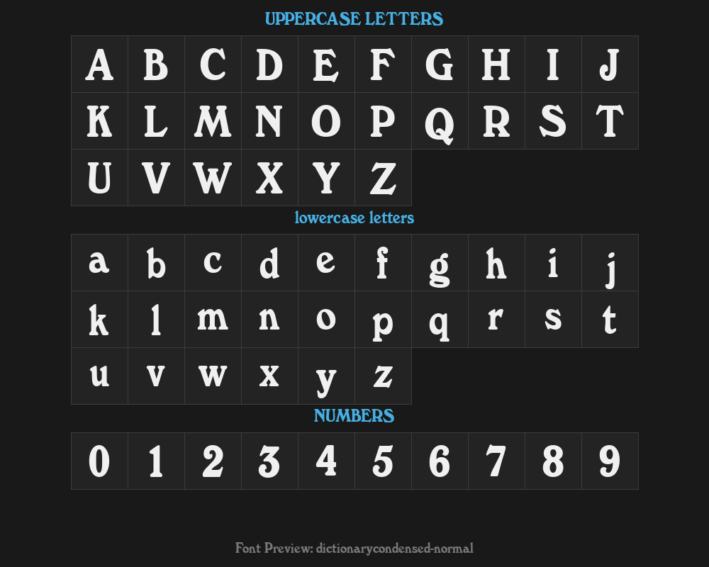 dictionarycondensed-normal is a font file with a size of 0.06 MB. The full font name is DictionaryCondensed Normal, 1.0 1995 2.0 2001 version. It contains 220 characters, supports 8 Chinese characters. The copyright belongs to DictionaryCondensed. dictionarycondensed-normal font is available for free download, but commercial use requires confirmation on the DictionaryCondensed official website whether it's free for commercial use.