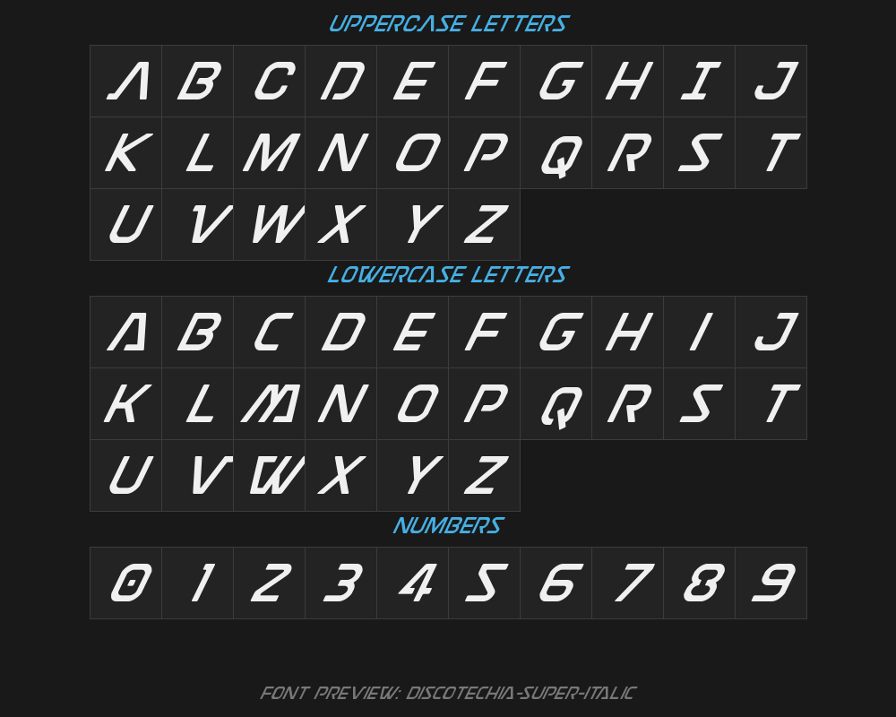 discotechia-super-italic is a font file with a size of 0.04 MB. The full font name is Discotechia Super-Italic, Version 1.0; 2014 version. It contains 219 characters, supports 8 Chinese characters. The copyright belongs to Discotechia Super-Italic. discotechia-super-italic font is available for free download, but commercial use requires confirmation on the Discotechia Super-Italic official website whether it's free for commercial use.