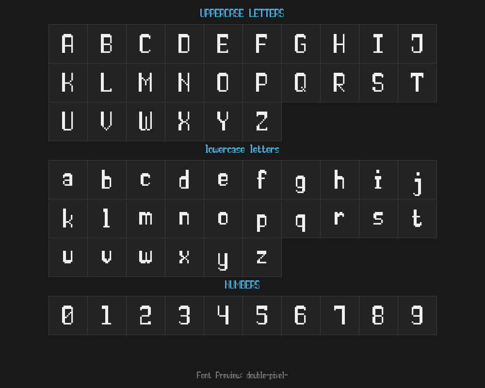 double-pixel-7 is a font file with a size of 0.03 MB. The full font name is Double Pixel-7, Version 1.000 version. It contains 312 characters, supports 8 Chinese characters. The copyright belongs to Double Pixel-7. double-pixel-7 font is available for free download, but commercial use requires confirmation on the Double Pixel-7 official website whether it's free for commercial use.
