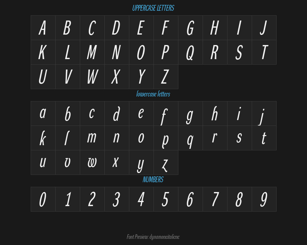 dynamorxcitalicrxc is a font file with a size of 0.03 MB. The full font name is DynamoRxcItalicRXC, 001.000 version. It contains 223 characters, supports 8 Chinese characters. The copyright belongs to Dynamo RXC. dynamorxcitalicrxc font is available for free download, but commercial use requires confirmation on the Dynamo RXC official website whether it's free for commercial use.