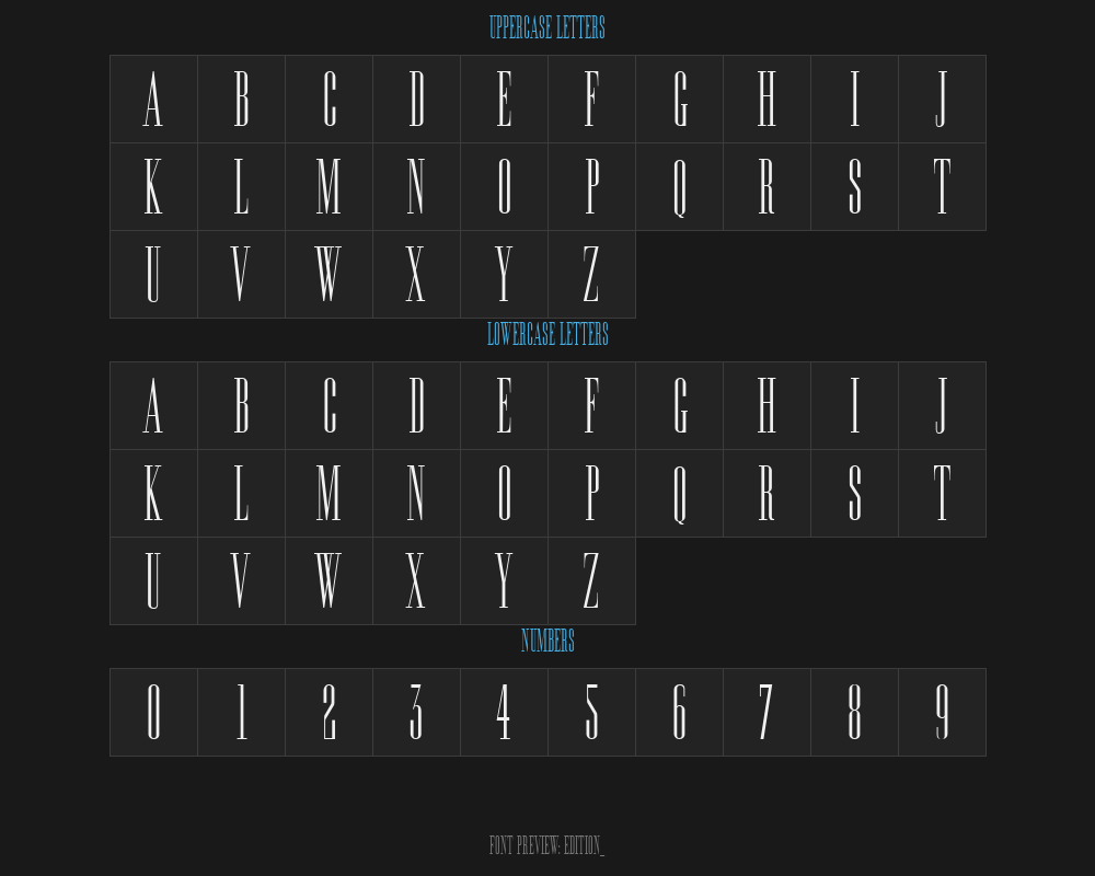 edition_ is a font file with a size of 0.02 MB. The full font name is Edition Regular, Altsys Metamorphosis 4 11 92 version. It contains 102 characters, supports 8 Chinese characters. The copyright belongs to Edition. edition_ font is available for free download, but commercial use requires confirmation on the Edition official website whether it's free for commercial use.