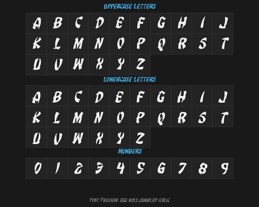 egg-roll-jumbled-italic is a font file with a size of 0.07 MB. The full font name is Egg Roll Jumbled Italic, Version 1.0; 2016 version. It contains 221 characters, supports 8 Chinese characters. The copyright belongs to Egg Roll Jumbled Italic. egg-roll-jumbled-italic font is available for free download, but commercial use requires confirmation on the Egg Roll Jumbled Italic official website whether it's free for commercial use.
