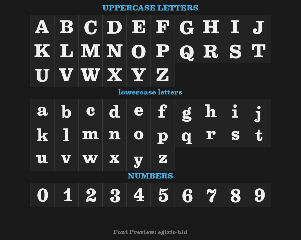 egizio-bld is a font file with a size of 0.03 MB. The full font name is Egizio-Bld, 4.0 version. It contains 220 characters, supports 8 Chinese characters. The copyright belongs to Egizio. egizio-bld font is available for free download, but commercial use requires confirmation on the Egizio official website whether it's free for commercial use.