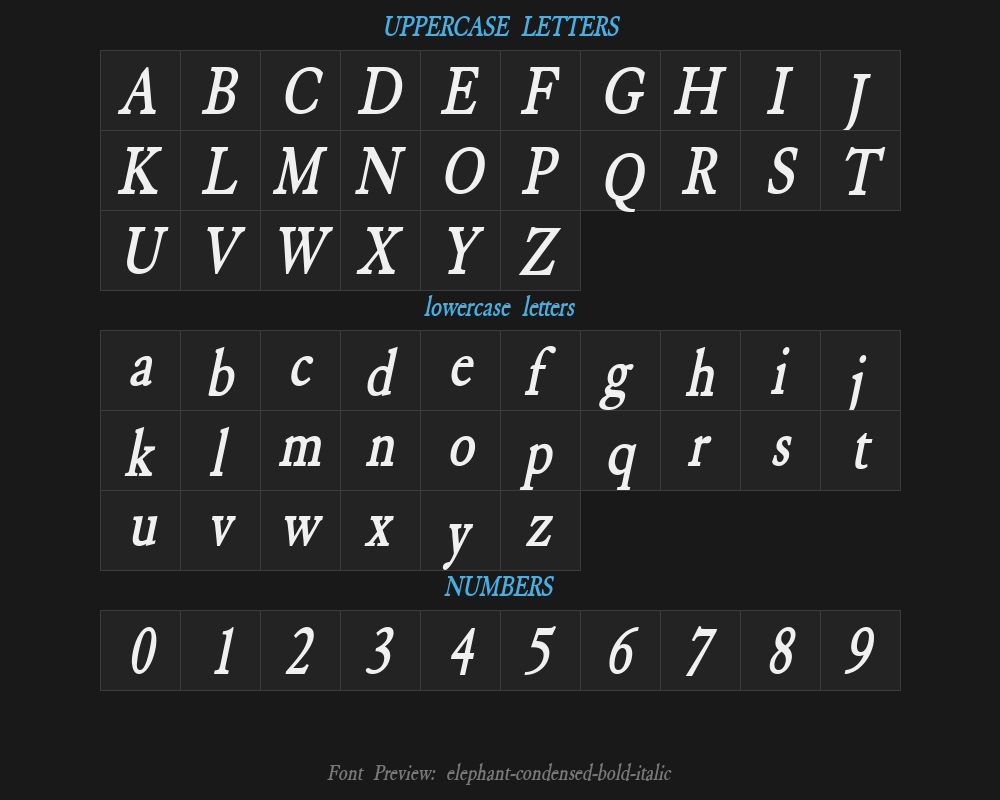 | PostScript name | Elephant-Condensed-BoldItalic |
