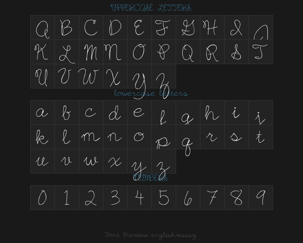 english-essay is a font file with a size of 0.04 MB. The full font name is English Essay, 1.0 version. It contains 100 characters, supports 8 Chinese characters. The copyright belongs to English Essay. english-essay font is available for free download, but commercial use requires confirmation on the English Essay official website whether it's free for commercial use.