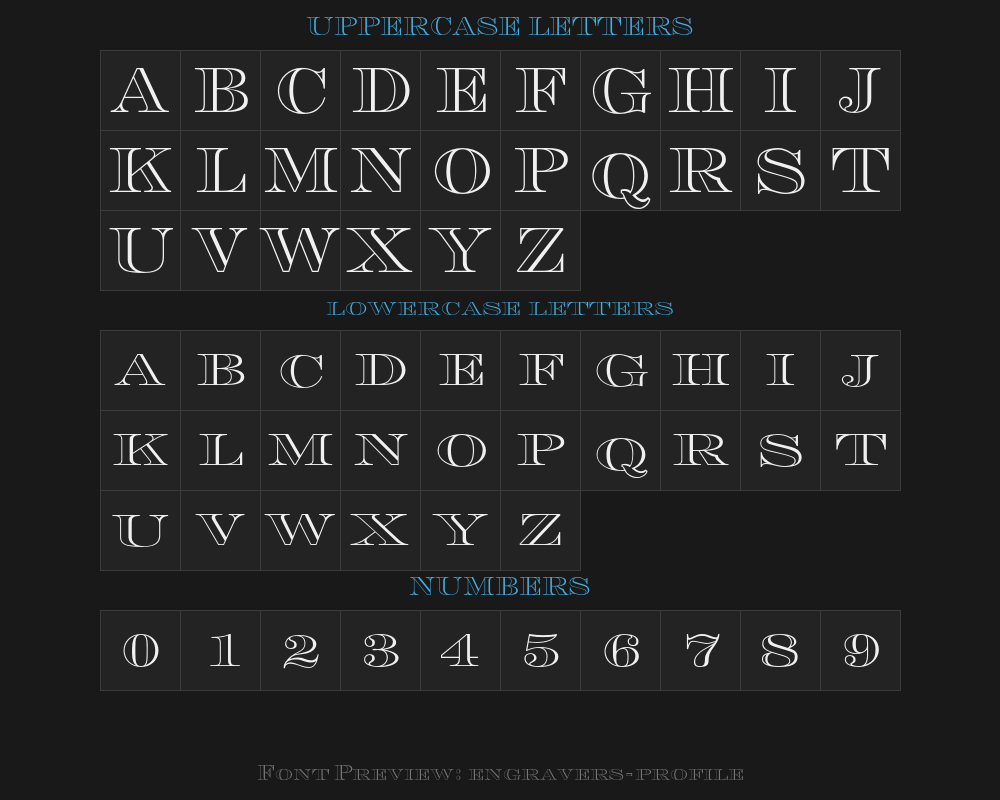 engravers-profile is a font file with a size of 0.03 MB. The full font name is Engravers-Profile, 001.001 version. It contains 141 characters, supports 8 Chinese characters. The copyright belongs to Engravers-Profile. engravers-profile font is available for free download, but commercial use requires confirmation on the Engravers-Profile official website whether it's free for commercial use.