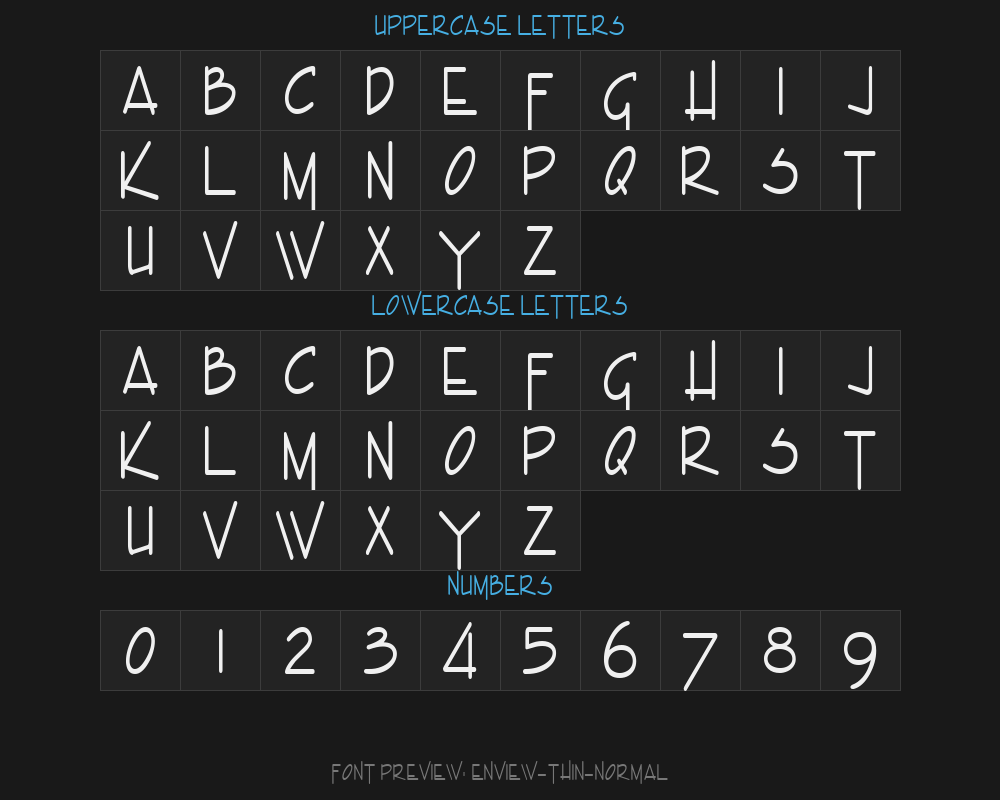enview-thin-normal is a font file with a size of 0.06 MB. The full font name is Enview Thin Normal, Altsys Fontographer 4.1 1 31 95 version. It contains 225 characters, supports 8 Chinese characters. The copyright belongs to Enview Thin. enview-thin-normal font is available for free download, but commercial use requires confirmation on the Enview Thin official website whether it's free for commercial use.