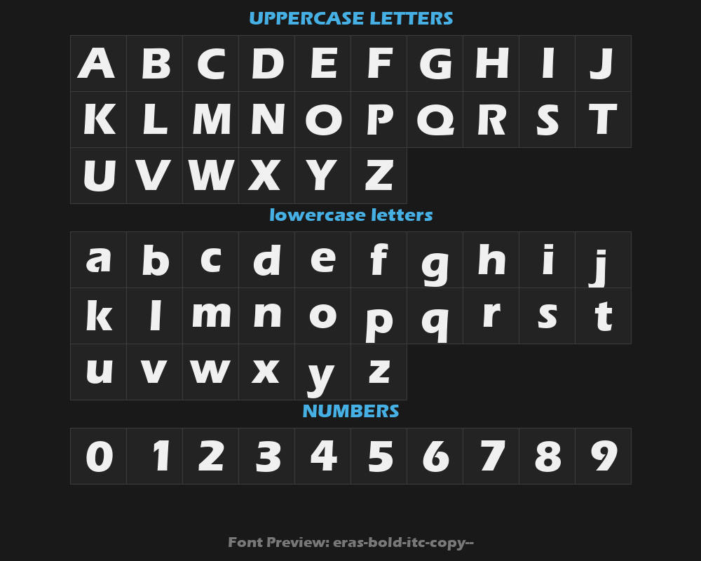 eras-bold-itc-copy-2- is a font file with a size of 0.05 MB. The full font name is Eras Bold ITC, Version 1.00 version. It contains 246 characters, supports 8 Chinese characters. The copyright belongs to Eras Bold ITC. eras-bold-itc-copy-2- font is available for free download, but commercial use requires confirmation on the Eras Bold ITC official website whether it's free for commercial use.