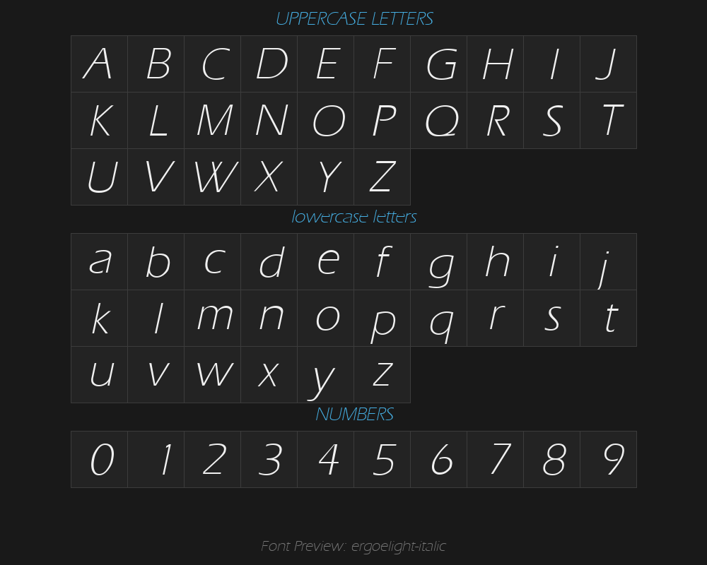 ergoelight-italic is a font file with a size of 0.04 MB. The full font name is ErgoeLight Italic, WSI 11 27 92 version. It contains 225 characters, supports 8 Chinese characters. The copyright belongs to ErgoeLight. ergoelight-italic font is available for free download, but commercial use requires confirmation on the ErgoeLight official website whether it's free for commercial use.