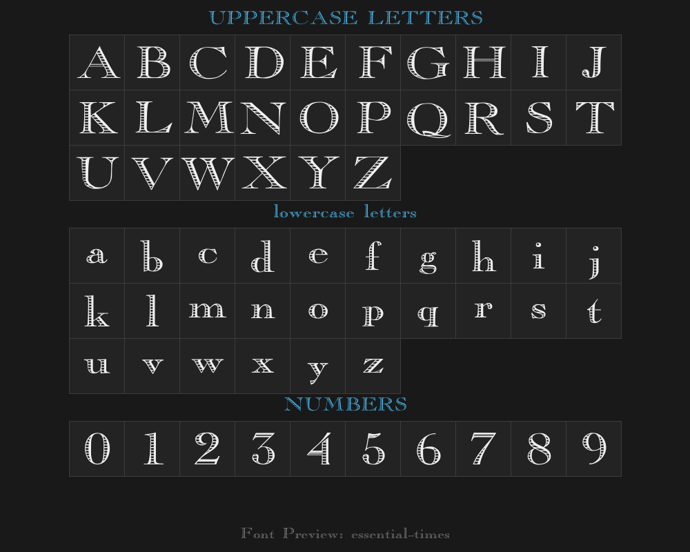 essential-times is a font file with a size of 0.04 MB. The full font name is Essential Times, 1.0 Mon Jan 03 16 39 16 1994 version. It contains 108 characters, supports 8 Chinese characters. The copyright belongs to Essential Times. essential-times font is available for free download, but commercial use requires confirmation on the Essential Times official website whether it's free for commercial use.