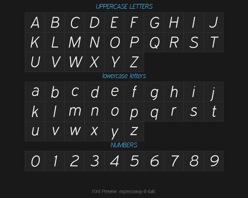 expressway-lt-italic is a font file with a size of 0.10 MB. The full font name is Expressway Lt Italic, Version 2.100 version. It contains 407 characters, supports 8 Chinese characters. The copyright belongs to Expressway Lt. expressway-lt-italic font is available for free download, but commercial use requires confirmation on the Expressway Lt official website whether it's free for commercial use.