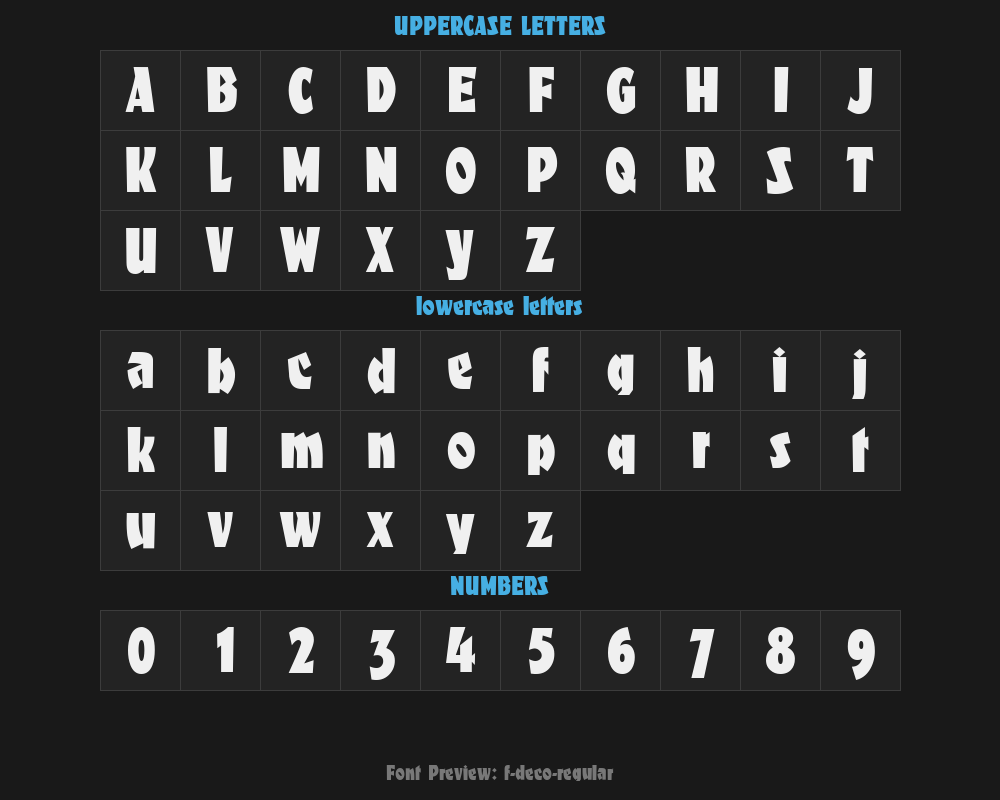 f650-deco-regular is a font file with a size of 0.04 MB. The full font name is F650-Deco-Regular, Version 1.0 20-10-2002 version. It contains 208 characters, supports 8 Chinese characters. The copyright belongs to F650-Deco. f650-deco-regular font is available for free download, but commercial use requires confirmation on the F650-Deco official website whether it's free for commercial use.