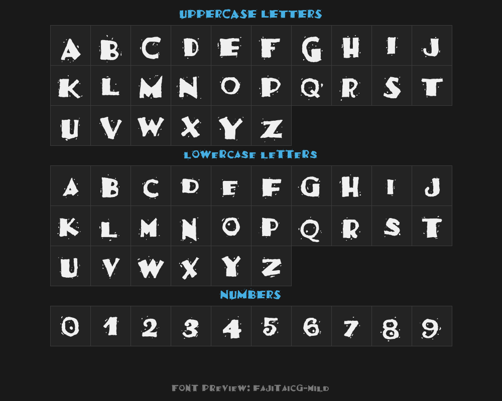 fajitaicg-mild is a font file with a size of 0.11 MB. The full font name is FajitaICG-Mild, 001.000 version. It contains 244 characters, supports 8 Chinese characters. The copyright belongs to FajitaICG Mild. fajitaicg-mild font is available for free download, but commercial use requires confirmation on the FajitaICG Mild official website whether it's free for commercial use.