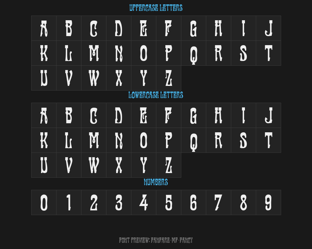 fanfare-mf-fancy is a font file with a size of 0.03 MB. The full font name is Fanfare MF Fancy, Macromedia Fontographer 4.1.3 9 15 05 version. It contains 207 characters, supports 8 Chinese characters. The copyright belongs to Fanfare MF. fanfare-mf-fancy font is available for free download, but commercial use requires confirmation on the Fanfare MF official website whether it's free for commercial use.