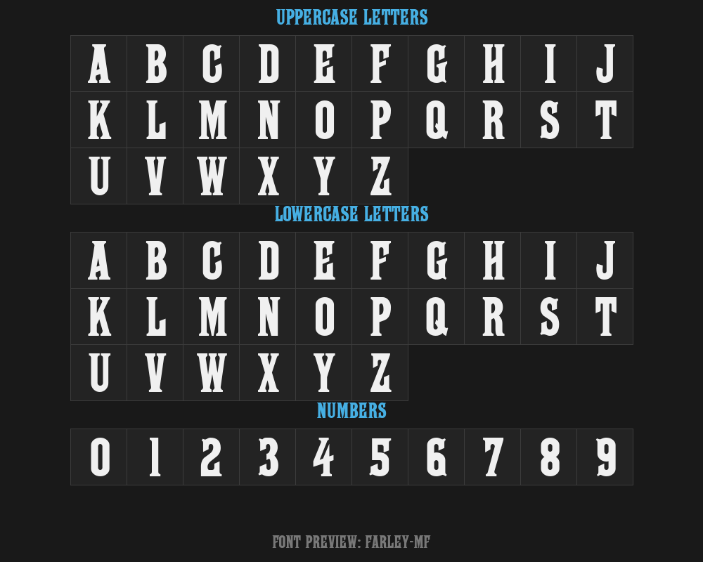 farley-mf is a font file with a size of 0.04 MB. The full font name is Farley MF, Macromedia Fontographer 4.1.3 9 15 05 version. It contains 221 characters, supports 8 Chinese characters. The copyright belongs to Farley MF. farley-mf font is available for free download, but commercial use requires confirmation on the Farley MF official website whether it's free for commercial use.