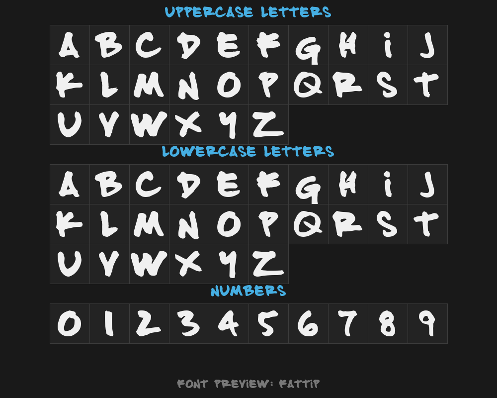 fattip is a font file with a size of 0.03 MB. The full font name is FATTIP, Macromedia Fontographer 4.1 5 3 96 version. It contains 89 characters, supports 8 Chinese characters. The copyright belongs to FATTIP. fattip font is available for free download, but commercial use requires confirmation on the FATTIP official website whether it's free for commercial use.
