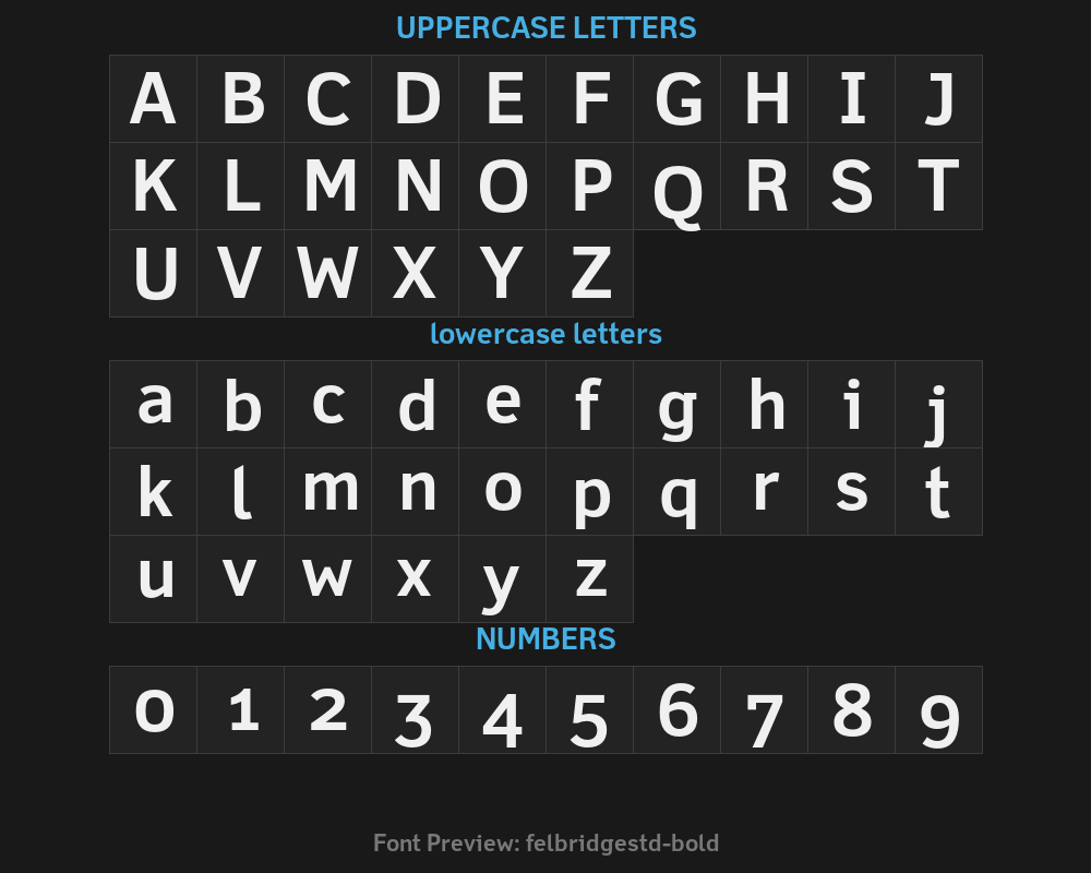 felbridgestd-bold is a font file with a size of 0.03 MB. The full font name is FelbridgeStd-Bold, Version 1.000;PS 001.000;hotconv 1.0.38 version. It contains 253 characters, supports 8 Chinese characters. The copyright belongs to Felbridge Std. felbridgestd-bold font is available for free download, but commercial use requires confirmation on the Felbridge Std official website whether it's free for commercial use.