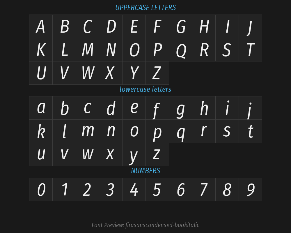 | PostScript name | FiraSansCondensed-BookItalic |