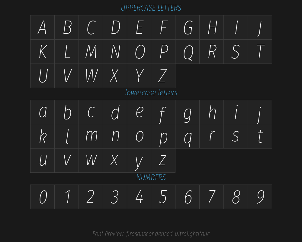 | PostScript name | FiraSansCondensed-UltraLightItalic |