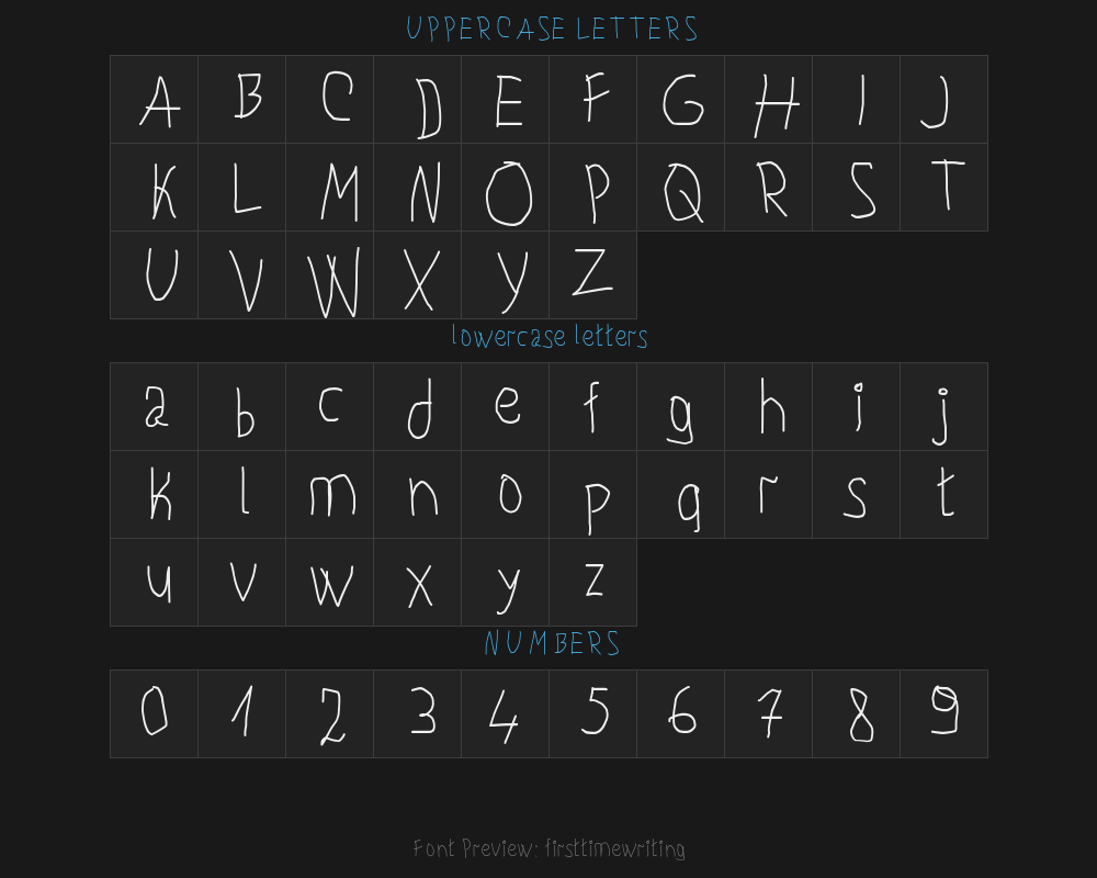 firsttimewriting is a font file with a size of 0.61 MB. The full font name is First Time Writing, 1.10 version. It contains 1104 characters, supports 8 Chinese characters. The copyright belongs to First Time Writing. firsttimewriting font is available for free download, but commercial use requires confirmation on the First Time Writing official website whether it's free for commercial use.
