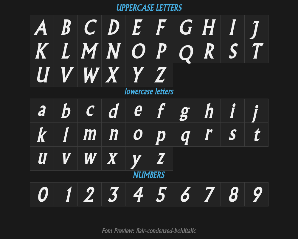 flair-condensed-bolditalic is a font file with a size of 0.06 MB. The full font name is Flair Condensed BoldItalic, Altsys Fontographer 4.1 2 1 95 version. It contains 225 characters, supports 8 Chinese characters. The copyright belongs to Flair Condensed. flair-condensed-bolditalic font is available for free download, but commercial use requires confirmation on the Flair Condensed official website whether it's free for commercial use.