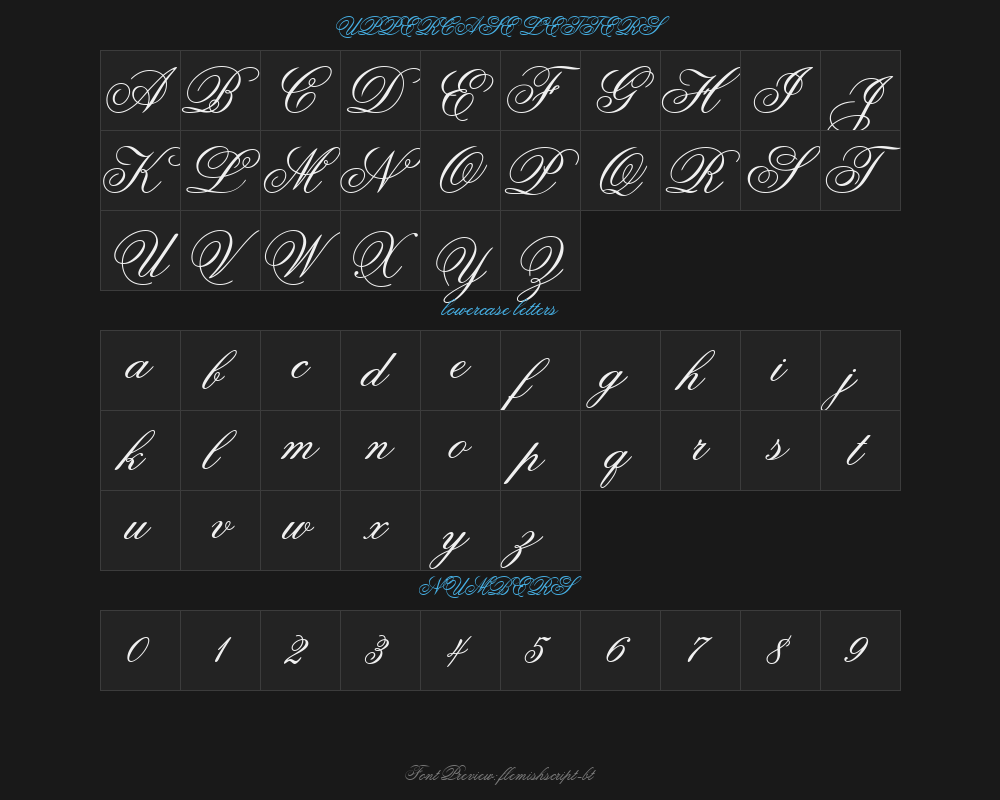 flemishscript-bt is a font file with a size of 0.07 MB. The full font name is FlemishScript BT, mfgpctt-v4.4 Dec 22 1998 version. It contains 259 characters, supports 8 Chinese characters. The copyright belongs to FlemishScript BT. flemishscript-bt font is available for free download, but commercial use requires confirmation on the FlemishScript BT official website whether it's free for commercial use.