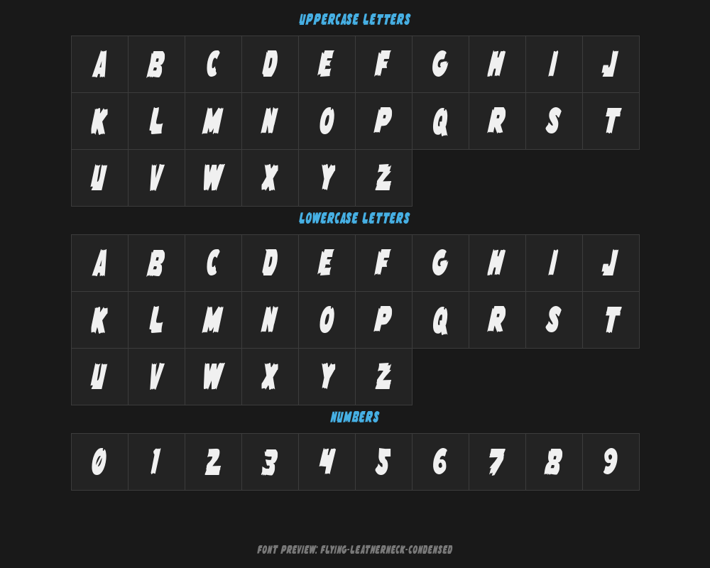 flying-leatherneck-condensed is a font file with a size of 0.03 MB. The full font name is Flying Leatherneck Condensed, 1 version. It contains 98 characters, supports 8 Chinese characters. The copyright belongs to Flying Leatherneck Condensed. flying-leatherneck-condensed font is available for free download, but commercial use requires confirmation on the Flying Leatherneck Condensed official website whether it's free for commercial use.