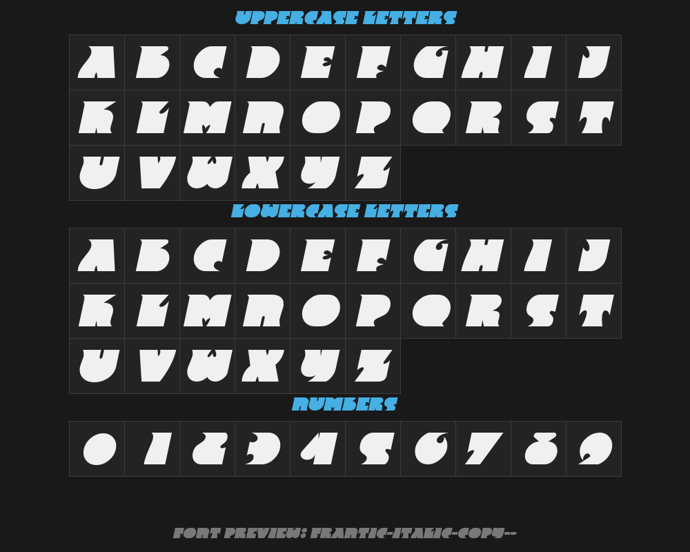frantic-italic-copy-1- is a font file with a size of 0.03 MB. The full font name is Frantic Italic, Macromedia Fontographer 4.1.5 5 18 98 version. It contains 229 characters, supports 8 Chinese characters. The copyright belongs to Frantic. frantic-italic-copy-1- font is available for free download, but commercial use requires confirmation on the Frantic official website whether it's free for commercial use.