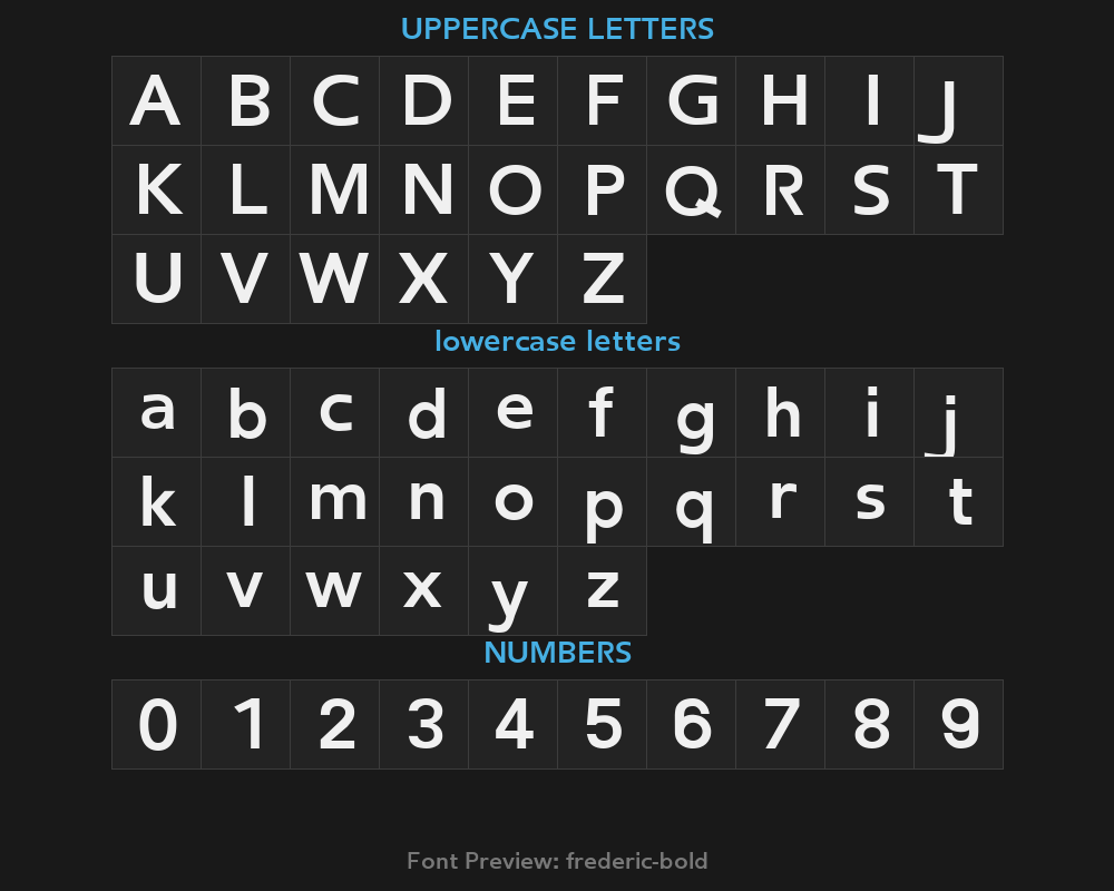 frederic-bold is a font file with a size of 0.05 MB. The full font name is Frederic Bold, Version 1.10 version. It contains 238 characters, supports 8 Chinese characters. The copyright belongs to Frederic. frederic-bold font is available for free download, but commercial use requires confirmation on the Frederic official website whether it's free for commercial use.